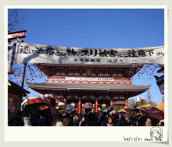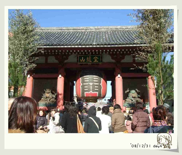 一過雷門,就是仲見世通~觀光街啦!因為今天也在日本人的連假時期,又是2008年的最後一天,人簡直多的不像話,這一條路要走還挺艱率的呢!因為這一天開始就在買一些紀念品,所以都沒在記帳了,所以也搞不清楚買了什麼...我記得的是買了一堆日本娃娃鑰匙圈,周先生買了金色的招財貓招財,菜小貞買了粉紅色的招桃花,至於桃花有沒有開?那就再問菜小貞吧!多少錢我也忘了...應該很便宜吧....