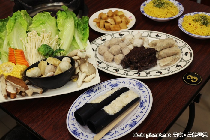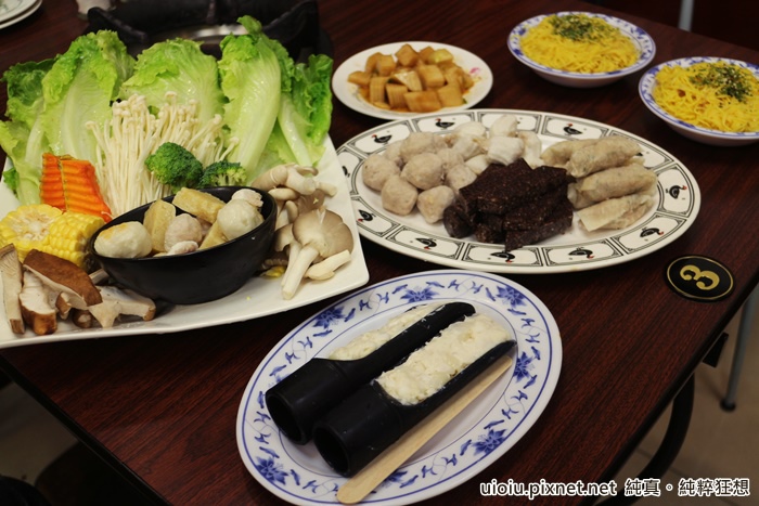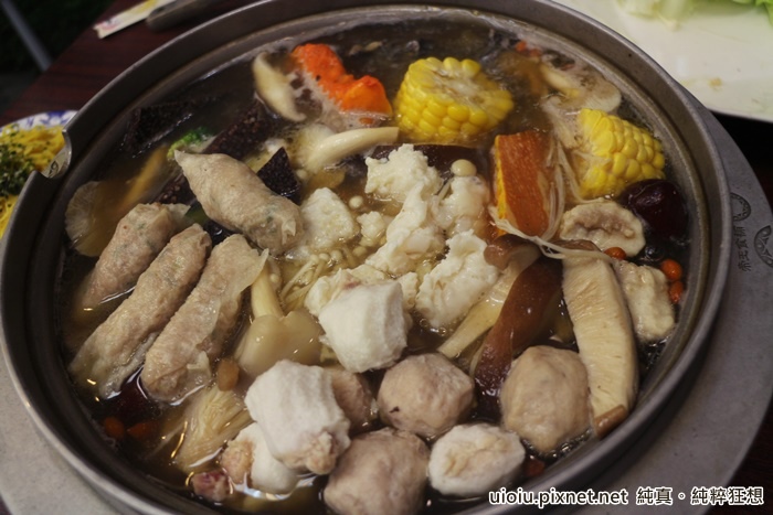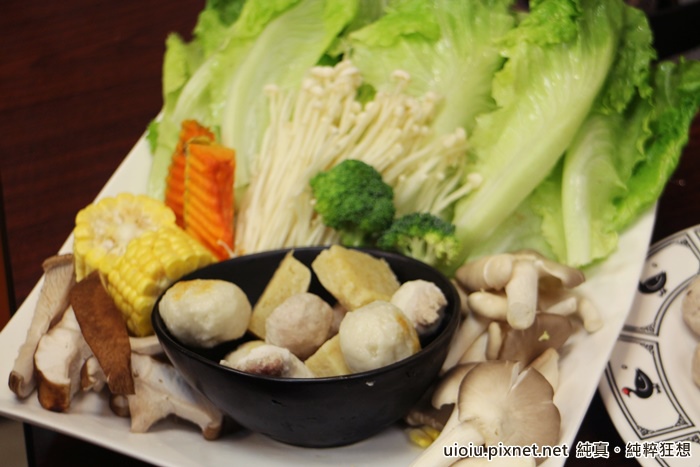 拼盤有青菜,有菇類,還有各式丸子類各一二,