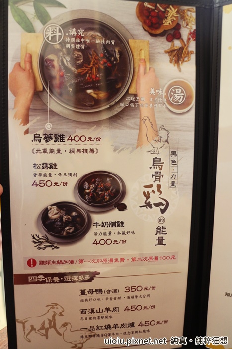 推薦菜色:烏蔘雞鍋、松露雞鍋、帝王筒、鴨菲力、太平燕餃、鴨肉丸、鴨血糕